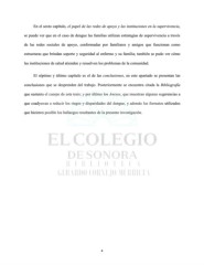 En el sexto capítulo, el papel de las redes de apoyo y las instituciones en la supervivencia, se puede ver que en el caso de dengue las familias utilizan estrategias de supervivencia a través de las redes sociales de apoyo, conformadas por familiares y amigos que funcionan como estructuras que brindan soporte y seguridad al enfermo y su familia; también se pudo ver cómo las instituciones de salud atienden y resuelven los problemas de la comunidad. El séptimo y último capítulo es el de las conclusiones, en este apartado se presentan las conclusiones que se desprenden del trabajo. Posteriormente se encuentra citada la Bibliografía que sustenta el cuerpo de esta tesis; y por último los Anexos, que muestran algunas sugerencias a que coadyuvan a reducir los riegos y disparidades del dengue, y además los formatos utilizados que hicieron posible los hallazgos resultantes de la presente investigación. 4