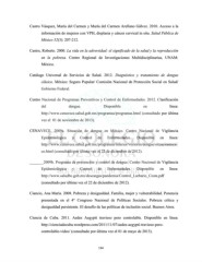 Castro Vásquez, María del Carmen y María del Carmen Arellano Gálvez. 2010. Acceso a la información de mujeres con VPH, displasia y cáncer cervical in situ. Salud Pública de México 52(3): 207-212. Castro, Roberto. 2000. La vida en la adversidad: el significado de la salud y la reproducción en la pobreza. Centro Regional de Investigaciones Multidisciplinarias, UNAM: México. Catálogo Universal de Servicios de Salud. 2012. Diagnóstico y tratamiento de dengue clásico. México: Seguro Popular/ Comisión Nacional de Protección Social en Salud/ Gobierno Federal. Centro Nacional de Programas Preventivos y Control de Enfermedades. 2012. Clasificación del dengue. Disponible en línea: http://www.cenavece.salud.gob.mx/programas/programas.html (consultado por última vez el 01 de noviembre de 2013). CENAVECE. 2009a. Situación de dengue en México. Centro Nacional de Vigilancia Epidemiológica y Control de Enfermedades. Disponible en línea: http://www.cenavece.salud.gob.mx/programas/interior/vectores/dengue/situacionmexi co.html (consultado por última vez el 22 de diciembre de 2012). _______2009b. Programa de prevención y control de dengue. Centro Nacional de Vigilancia Epidemiológica y Control de Enfermedades. Disponible en línea: http://www.saludbc.gob.mx/descargas/pandemia/Control_Larbario_Costa.pdf (consultado por última vez el 22 de diciembre de 2012). Ciancio, Ana María. 2008. Pobreza y desigualdad. Familia, mujer y vulnerabilidad. Ponencia presentada en el 4° Congreso Nacional de Políticas Sociales. Pobreza crítica y desigualdad persistente. El desafío de las políticas de inclusión social. Buenos Aires. Ciencia de Cuba. 2011. Aedes Aegypti travieso pero controlable. Disponible en línea: http://cienciadecuba.wordpress.com/2011/11/07/aedes-aegypti-travieso-pero- controlable-video/ (consultado por última vez el 01 de mayo de 2013). 134