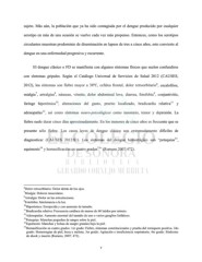 sujeto. Más aún, la población que ya ha sido contagiada por el dengue producido por cualquier serotipo en más de una ocasión se vuelve cada vez más propenso. Entonces, como los serotipos circulantes muestran predominio de diseminación en lapsos de tres a cinco años, esto convierte al dengue en una enfermedad progresiva y recurrente. El dengue clásico o FD se manifiesta con algunos síntomas físicos que suelen confundirse con síntomas gripales. Según el Catálogo Universal de Servicios de Salud 2012 (CAUSES, 6 2012), los síntomas son fiebre mayor a 38ºC, cefalea frontal, dolor retroorbitario , escalofríos, 8 9 7 mialgia , artralgias , náuseas, vómito, dolor abdominal leve, diarrea, fotofobia , conjuntivitis, 10 11 faringe hiperémica , alteraciones del gusto, prurito localizado, bradicardia relativa y 12 adenopatías , así como síntomas neuro-psicológicos como insomnio, temor y depresión. La fiebre suele durar cinco días aproximadamente. En los menores de cinco años es frecuente que se presente sólo fiebre. Los casos leves de dengue clásico son extremadamente difíciles de 13 diagnosticar (CAUSES 2012:81). Los síntomas del dengue hemorrágico son “petequias , 15 14 equimosis y hemasificación en cuatro grados ” (Romero 2007:472). 6 Dolor retroorbitario: Dolor detrás de los ojos. 7 Mialgia: Dolores musculares. 8 Artralgia: Dolor en las articulaciones. 9 Fotofobia: Intolerancia a la luz. 10 Hiperémica: Enrojecida y con aumento de tamaño. 11 Bradicardia relativa: Frecuencia cardíaca de menos de 60 latidos por minuto. 12 Adenopatías: Aumento anormal del tamaño de uno o varios ganglios linfáticos. 13 Petequias: Manchas pequeñas de sangre sobre la piel. 14 Equimosis: Manchas y bolsas de sangre grandes bajo la piel. 15 Hemasificación en cuatro grados: 1er grado: Fiebre, síntomas constitucionales y prueba del torniquete positiva. 2do grado: Hemorragias de piel, boca y melena. 3er grado: Agitación e insuficiencia respiratoria. 4to grado: Síndrome de shock y muerte (Romero, 2007: 472). 7