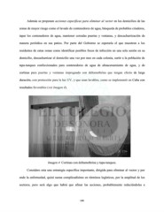 Además se proponen acciones específicas para eliminar al vector en los domicilios de las zonas de mayor riesgo como el lavado de contenedores de agua, búsqueda de probables criaderos, tapar los contenedores de agua, mantener cerradas puertas y ventanas, y descacharrización de manera periódica en sus patios. Por parte del Gobierno se esperaría el que muestren a los residentes de estas zonas como identificar posibles focos de infección en una sola sesión en su domicilio, descacharrizar el domicilio una vez por mes en cada colonia, surtir a la población de tapa-tanques confeccionados para contenedores de agua de almacenamiento de agua, y de cortinas para puertas y ventanas impregnada con deltamethrina que tengan efecto de larga duración, con protección para la luz UV, y que sean lavables, como se implementó en Cuba con resultados favorables (ver Imagen 4). Imagen 4 Cortinas con deltamethrina y tapa-tanques. Considero esta una estrategia específica importante, dirigida para eliminar al vector y por ende la enfermedad, quizá suena complicadísimo en términos logísticos, por la amplitud de los sectores, pero será algo que habrá que afinar las acciones, probablemente reduciéndolas a 146