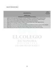 Anexo 8. Guía entrevista 3 GUÍA ENTREVISTA 3 SABERES LEGOS Articulación entre representaciones y prácticas 1. ¿Quiénes son los responsables de prevenir y atender el dengue en la sociedad? (Papel y cosas por hacer). 2. ¿Qué cosas no se hacen y usted considera necesario que se realicen para prevenir y atender el dengue? 3. ¿Cómo es que se enferma alguien de dengue? (Cómo, dónde y por qué se adquiere). 4. ¿Alguien enfermó mientras lo visitaba o cuidaba, o viceversa? (Usted visitó o cuidó a algún enfermo). 5. ¿Cómo ven en la comunidad a los enfermos de dengue? 6. ¿Cuáles son los temores que produce esta enfermedad a la comunidad? (Sus miedos y temores antes y después). 7. ¿Qué consecuencias trae consigo haber padecido dengue? (Físicas, emocionales y económicas). 8. ¿Cómo cree que se tiene que alimentar el enfermo de dengue? (Qué comía y cuántos kilos perdió) 156