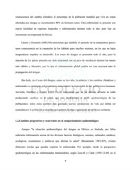 consecuencia del cambio climático el porcentaje de la población mundial que vive en zonas afectadas por dengue se incrementará 40% en términos netos. Esta enfermedad se presenta con mayor facilidad en regiones tropicales y subtropicales durante todo el año, pero hay un incremento en temporada de lluvias. Lázaro y Escarmis (2002:94) mencionan que también el aumento de la temperatura parece tener consecuencia en la expansión de los hábitats para muchos vectores, en los que en bajas temperaturas impiden su desarrollo. Los casos de dengue se presentan todo el año, pero la mayoría de los países presenta un ciclo estacional con un pico de incidencia durante los meses más cálidos y húmedos, por lo que el calentamiento global podría ser una amenaza ante la propagación del dengue. Sin duda, en el caso del dengue, como se ha visto, la pobreza y los cambios climáticos y ambientales se conjugan peligrosamente aumentando la exposición de las poblaciones humanas. Acevedo, Martínez y Estario (2007:19-23) mencionan que en las últimas décadas se están produciendo cambios en la salud, que van modificando el perfil epidemiológico de las poblaciones; todos estos cambios han generado nuevas condiciones de vida que deben ser asumidas por la población y resueltas por quienes diseñan y gestionan las políticas sanitarias. 1.2.Cambios progresivos y recurrentes en el comportamiento epidemiológico Aunque “la situación epidemiológica del dengue en México es limitada, por faltar suficiente información acerca de los diversos factores biológicos, sociales, culturales, médicos, ecológicos, económicos y políticos que afectan la salud” (Bustamante 1982:425), existen diferentes teorías que pueden explicar la enfermedad. Por ejemplo, desde la perspectiva epidemiológica de las enfermedades transmisibles, según Leavell y Clark (1958:13-49) en el 9