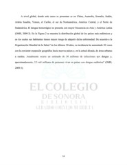 A nivel global, donde más casos se presentan es en China, Australia, Somalia, Sudán, Arabia Saudita, Yemen, el Caribe, el sur de Norteamérica, América Central, y el Norte de Sudamérica. El dengue hemorrágico se presenta con mayor frecuencia en Asia y América Latina (OMS, 2009:3). En la Figura 2 se muestra la distribución global de los países más endémicos y en los cuales sus habitantes tienen mayor riesgo de adquirir dicha enfermedad. De acuerdo a la Organización Mundial de la Salud “en los últimos 50 años, su incidencia ha aumentado 30 veces con la creciente expansión geográfica hacia nuevos países y, en la actual década, de áreas urbanas a rurales. Anualmente ocurre un estimado de 50 millones de infecciones por dengue y, aproximadamente, 2.5 mil millones de personas viven en países con dengue endémico” (OMS, 2009:3). 14