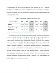 a nivel nacional el año pico con mayor número de brotes de dengue fue 2009, y de dengue hemorrágico fue 2012. El mayor número de defunciones producidas por dengue hemorrágico ocurrió en 2009, aunque en ese año hubo un menor número de casos de dengue hemorrágico que en 2012 (SSA, 2008-2012). Figura 7. Panorama del dengue en México 2007-2012 Panorama México 2007 2008 2009 2010 2011 2012 Dengue 42,936 28,017 44,565 23,608 10,970 32,662 Dengue Hemorrágico 9,433 7,588 11,396 6,548 4,608 17,706 Defunciones 29 38 96 84 50 64 Fuente: elaboración propia con base en información de SSA 2008-2012. En Sonora, a partir del año 2000 se cuenta con programas de vigilancia virológica para ver el comportamiento de este fenómeno; por medio de estos programas se ha podido corroborar que la mayor parte de los brotes se dan en temporadas de lluvia entre los meses de julio y diciembre, siendo su principal pico de la semana 35 a la 38, para después ir decreciendo gradualmente. De acuerdo a los mapas de la Figura 8, en los últimos años este fenómeno se ha presentado en distintos municipios de climas diversos; sin embargo, existe una constante en el centro y suroeste del estado. Esto puede deberse a que en esta región abunda la humedad y las altas temperaturas, clima idóneo para la reproducción de vectores (SINAVE 2012:141). Asimismo en estos municipios es donde se concentra la mayor parte de la población, y esta última podría ser una variable más para que se multiplicaran los casos. 19