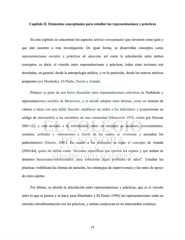 II. Capítulo II. Elementos conceptuales para estudiar las representaciones y prácticas En este capítulo se concentran los aspectos teórico-conceptuales que sirvieron como guía y que dan sustento a esta investigación. De igual forma, se desarrollan conceptos como representaciones sociales y prácticas de atención, así como la articulación entre ambos conceptos, es decir, el vínculo entre representaciones y prácticas; todas estas nociones son abordadas, en general, desde la antropología médica, y en lo particular, desde los marcos teóricos propuestos por Menéndez, Di Pardo, Osorio y Aranda. Primero se parte de una breve discusión entre representaciones colectivas de Durkheim y representaciones sociales de Moscovici, y se decide adoptar estas últimas, como un sistema de valores e ideas con una doble función: establecer un orden a los individuos y proporcionar un código de intercambio a los miembros de una comunidad (Moscovici 1976, citado por Duveen 2001:12); y más acotado a la enfermedad, como un conjunto de nociones, conocimientos, creencia, actitudes y valoraciones a través de los cuales se vivencian y aprenden los padecimientos (Osorio, 2001). En cuanto a las prácticas, se sigue el concepto de Aranda (2010:44), quien las define como “acciones específicas que ejercen los sujetos y que actúan en términos funcionales-intencionales, para solucionar algún problema de salud”. Estudiar las prácticas visibilizará las formas de atención, las estrategias de supervivencia y las redes de apoyo de estos sujetos. Por último, se aborda la articulación entre representaciones y prácticas, que es el vínculo entre lo que se piensa y se hace; para Menéndez y Di Pardo (1996) las representaciones están en estrecha retroalimentación con las prácticas, y ambas coadyuvan en un intercambio continuo. 23