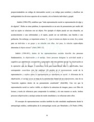 proporcionándoles un código de intercambio social y un código para nombrar y clasificar sin ambigüedades los diversos aspectos de su mundo y de su historia individual y grupal. Jodelet (1986:478), establece que “toda representación social es representación de algo y de alguien”. Dicho en otras palabras, la representación es un acto de pensamiento por medio del cual un sujeto se relaciona con un objeto. Por ejemplo el objeto puede ser una situación, un acontecimiento o una enfermedad; y el sujeto, puede ser un individuo, una familia o una población. Sin embargo, es importante aclarar, “[…] por sí mismo un objeto no existe. Es y existe para un individuo o un grupo y en relación con ellos. Así pues, la relación sujeto-objeto determina al objeto mismo” (Abric 2001:12). Jodelet (1986:481), dentro de las representaciones sociales describe dos procesos fundamentales, la objetivación y el anclaje. Estos procesos designan la actividad social y cognitiva que permiten la construcción y generación del conocimiento social. La objetivación es la operación que da imagen y estructura; sirve para materializar ideas y significados, hace corresponder cosas/ideas con las palabras. El anclaje es el enraizamiento social de la representación y explica cómo la representación se transforma en social. A diferencia de la objetivación, el anclaje ya no se trata de la constitución formal de un conocimiento, sino de su “inserción orgánica dentro de un pensamiento constituido” (ibid:486). Una vez que la representación social se vuelve visible, se objetiva la estructura de imagen, pasa a ser filtro de lectura y teoría de referencia para comprender la realidad, y de esta manera se ancla. Ambos procesos (objetivación y anclaje) actúan de modo simultáneo y se refuerzan entre ellos. El concepto de representaciones sociales también ha sido estudiado ampliamente desde la antropología médica, subdisciplina de la antropología social, por Menéndez y Di Pardo (1996), 25