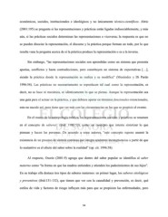 económicos, sociales, institucionales e ideológicos y no únicamente técnico-científicos. Abric (2001:195) se pregunta si las representaciones y prácticas están ligadas indisociablemente, y más aún, si las prácticas sociales determinan las representaciones o viceversa; la respuesta es que no se pueden disociar la representación, el discurso y la práctica porque forman un todo, por lo que resulta vana la pregunta acerca de si la práctica produce la representación o es a la inversa. Sin embargo, “las representaciones sociales son aprendidas como un sistema que presenta aporías, conflictos y hasta contradicciones, pero constituyen un sistema de expectativas […], siendo la práctica donde la representación se realiza y se modifica” (Menéndez y Di Pardo 1996:54). Las prácticas no necesariamente se reproducen tal cual como la representación, es decir, no se hace ni mecánica, ni idénticamente lo que se piensa. Aunque la representación sea una guía para el actuar en la práctica, y que debiera operar en términos funcionales-intencionales, esto no sucede así, pues tiene que ver más con las circunstancias en las que se propicie el evento. En el marco de la antropología médica, las representaciones sociales y prácticas se resumen en el concepto de saberes (ibid. 1996:53), como un concepto que intenta sintetizar lo que piensan y hacen las personas. De acuerdo a estos autores, “este concepto supone asumir la existencia de un proceso de síntesis continua que integra aparentes incongruencias a partir de que lo sustantivo es el efecto del saber sobre la realidad” (op. cit. 1996:58). Al respecto, Osorio (2001:9) agrega que dentro del saber popular se identifica al saber materno como “la forma en que las madres entienden y atienden los padecimientos de sus hijos”. En su trabajo ella destaca tres tipos de saberes maternos: en primer lugar, los saberes etiológicos y preventivos (ibid:131-132), que tienen que ver con la causalidad y prevención, es decir, qué estilos de vida y factores de riesgo influyen más para que se propicien las enfermedades, pero 34