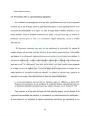 Fuente: Elaboración propia 4.3. Prevención: entre la representación y la práctica En la literatura de investigación social en salud, predominan textos en los que es posible encontrar que la jefa de hogar, desde su papel de madre/esposa, ha sido la principal actora en la prevención de enfermedades en el hogar. Las jefas de hogar desde el ámbito doméstico y en el pensar materno, crean un ambiente sostenedor que aporta a los que están bajo su cuidado la protección necesaria para su vida y un crecimiento integral (Hernández, Arenas y Valdés, 2001:443-50). Es importante mencionar que antes de que padecieran la enfermedad los sujetos de estudio, ninguna jefa de hogar realizaba prácticas de prevención contra el dengue. Cabe señalar que después de la enfermedad, algunas prácticas de prevención en las viviendas han cambiado. A través de los testimonios y las observaciones se pudo constatar que el dengue es un fenómeno que tiene que vivirse “en carne propia” para saber qué se siente y por ende cambiar ciertas prácticas en el hogar, es decir, en algunos casos, si la jefa de hogar no es la que enfermó de dengue, ella no realiza prácticas de prevención contra este malestar. Un ejemplo de esto es Candy, quien no ha padecido la enfermedad y cuyo hijo enfermó de fiebre por dengue hemorrágico: […] pero precisamente para prevenir no hacíamos nada, no sabíamos, ni ahora ¿No? Porque ni nos acordamos, ni nos acordamos la verdad del dengue, especialmente para eso no limpiamos, limpiamos porque tenemos que limpiar, pero para eso no (Candy 47, FD). Caso contrario al de las jefas de hogar que han padecido dengue, ya que después de la experiencia han cambiado sus prácticas; la estructura de sus conocimientos se ha modificado, y de esta manera se han apropiado de algunos aprendizajes preventivos que reproducen en sus 71