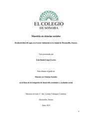 Maestría en ciencias sociales Productividad del agua en el sector industrial en la ciudad de Hermosillo, Sonora. Tesis presentada por Iván Daniel López Loreto Para obtener el grado de Maestro en Ciencias Sociales en la línea de investigación de desarrollo económico y exclusión social Directora de tesis: C. Dra. Lorenia Velázquez Contreras Hermosillo, Sonora Junio 2014 0