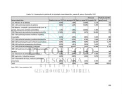 Cuadro 36. Comparación de variables de las principales ramas industriales usuarias de agua en Hermosillo, 2009 Personal Productividad del Ramas industriales Establecimientos (%) Valor agregado (%) Gasto en agua (%) ocupado (%) agua (Pesos) 3121 Industria de las bebidas 6.56% 5.39% 25.99% 5.51% 127 3261 Fabricación de productos de plástico 0.86% 5.58% 13.69% 5.49% 250 3116 Matanza, empacado y procesamiento de carne de ganado, aves y otros animales comestibles 1.14% 5.46% 10.96% 4.78% 305 3118 Elaboración de productos de panadería y tortillas 37.84% 3.36% 5.47% 10.48% 376 3321 Fabricación de productos metálicos forjados y troquelados 0.03% 6.94% 4.82% 3.26% 882 3273 Fabricación de cemento y productos de concreto 1.22% 9.23% 4.78% 2.84% 1,182 3363 Fabricación de partes para vehículos automotores 0.39% 8.99% 4.09% 12.23% 1,347 3344 Fabricación de componentes electrónicos 0.03% 1.61% 2.65% 5.49% 371 3361 Fabricación de automóviles y camiones 0.05% 39.15% 2.62% 10.05% 9,152 3323 Fabricación de estructuras metálicas y productos de herrería 13.56% 1.05% 1.90% 4.65% 340 3111 Elaboración de alimentos para animales 0.16% 0.49% 1.61% 0.39% 187 3231 Impresión e industrias conexas 4.69% 0.42% 1.46% 2.87% 177 3114 Conservación de frutas, verduras y alimentos preparados 0.26% 0.24% 1.43% 0.76% 102 Total 100% 100% 100% 100% 602.11 Fuente: INEGI, Censos económicos, 2009. 101