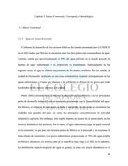 Capítulo 2. Marco Contextual, Conceptual y Metodológico 2.1 Marco Contextual 2.1.1 Agua en zonas de escasez El informe de desarrollo de los recursos hídricos del mundo presentado por la UNESCO en el 2010 indica que México se encuentra entre los diez países más consumidores de agua. Además, señala que aproximadamente el 20% del agua utilizada en el mundo procede de fuentes de agua subterráneas y su proporción va aumentando. Especialmente en las regiones secas, el agua se obtiene mayormente de los mantos acuíferos. En ese sentido, la ciudad de Hermosillo localizada en una zona semidesértica depende principalmente de las aguas subterráneas y el agua que abastece a su población se obtiene de los pozos que están localizados en las cuencas cercanas a la ciudad. Marín (2002) muestra cómo en México la ubicación de la población y de los principales polos de desarrollo industrial está inversamente relacionada con la disponibilidad del agua. En México, el clima en la zona norte es árido o semiárido; en esta zona se encuentran las ciudades más grandes del país, así como las principales concentraciones de actividad industrial y agrícola. Sin embargo, esta región dispone de menos de la tercera parte de los recursos hidráulicos del territorio. Por lo tanto, el agua subterránea juega un papel esencial en la economía, ya que para dos terceras partes de México es la principal y en ocasiones la única fuente de suministro. Los pozos subterráneos proporcionan el 70% del agua potable en México, abastecen a la tercera parte de la superficie bajo riego y el 50% de la industria. La distribución espacio-temporal del agua es grande, la zona con mayor abundancia es el 14