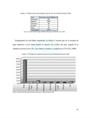 Cuadro 4. Volumen total concesionado por tipo de usos en el estado de Sonora, 2008 Usos Demanda estatal 2008 (hm³) Domestico 350 Agrícola 6093 Industrial 69 Pecuario 53 Otros 10 Total Estado 6575 Fuente: Comisión Estatal del Agua, Estadísticas del agua en el estado de Sonora, 2008. Desagregando las actividades industriales, la Gráfica 3 muestra que en el consumo de agua industrial a nivel estatal destaca la minería con el 80% del total, seguido de la industria cervecera con el 5%, y por último la celulosa y el papel con el 2% (CEA, 2008). Gráfica 3. Porcentaje de consumo de agua por tipo de industria en Sonora, 2008 Fuente: Comisión Estatal del Agua, Estadísticas del agua en el estado de Sonora, 2008. 24