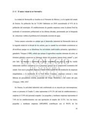 2.1.5 El sector industrial en Hermosillo La ciudad de Hermosillo se localiza en el Noroeste de México y es la capital del estado de Sonora. Su población fue de 715,061 habitantes en 2010 concentrando el 91% de la población del municipio. El establecimiento de grandes empresas como la planta Ford ha acelerado el crecimiento poblacional en las últimas décadas, presionando por la búsqueda de soluciones viables al problema de la demanda creciente de agua. Varios autores coinciden en señalar que el desarrollo industrial de Hermosillo inicia en la segunda mitad de la década de los setenta, que es cuando las actividades económicas se diversifican aunque no se abandonan las actividades tradicionales primarias, agricultura y ganadería. Vázquez (1988), señala que aunque la agricultura muestra síntomas de crisis, en términos globales conservan su liderazgo dentro del producto interno bruto estatal” y, por otro lado “se empieza a conformar un sector secundario que poco a poco ha venido induciendo cambios cualitativos en el panorama general de la composición económica del estado. Este nuevo programa empieza a tomar forma a partir de las instalación de empresas maquiladoras, y la instalación de la Ford Motor Company, empresas conexas y otras fábricas de procedencia externa, propiedad del Grupo Monterrey y del centro del país (Vázquez, 1988, 105)”. En Sonora, la actividad industrial está conformada en su mayoría por microempresas; como se presenta el Cuadro 5, estas representan el 91.2% del total de establecimientos y emplean el 15.8% del personal ocupado. Las pequeñas y medianas empresas representan el 7.6% de los establecimientos con una aportación al empleo del 23.5%. Así, las micro, pequeñas y medianas empresas (MPyMES) contribuyen con el 98.8% de los 25