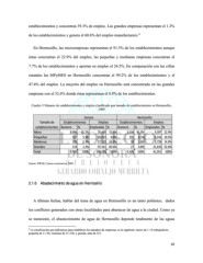 establecimientos y concentran 39.3% de empleo. Las grandes empresas representan el 1.2% 6 de los establecimientos y genera el 60.6% del empleo manufacturero. En Hermosillo, las microempresas representan el 91.5% de los establecimientos aunque éstas concentran el 22.9% del empleo, las pequeñas y medianas empresas concentran el 7.7% de los establecimientos y aportan en empleo el 24.5%. En comparación con las cifras estatales las MPyMES en Hermosillo concentran el 99.2% de los establecimientos y el 47.4% del empleo. La mayoría del empleo en Hermosillo está concentrado en las grandes empresas con el 52.6% donde éstas representan el 0.8% de los establecimientos. Cuadro 5 Número de establecimientos y empleo clasificado por tamaño de establecimiento en Hermosillo, 2009 Sonora Hermosillo Tamaño de Establecimientos Empleo Establecimientos Empleo establecimientos Numero % Empleados % Numero % Empleados % Micro 8,904 91.2% 25,445 15.8% 3,134 91.5% 9,397 22.9% Pequeñas 517 5.3% 10,613 6.6% 210 6.1% 4,316 10.5% Medianas 220 2.3% 27,159 16.9% 55 1.6% 5,728 14.0% Grandes 119 1.2% 97,411 60.6% 27 0.8% 21,610 52.6% Total 9,760 100% 160,628 100% 3,426 100% 41,051 100% Fuente: INEGI, Censos económicos, 2009. 2.1.6 Abastecimiento de agua en Hermosillo A últimas fechas, hablar del tema de agua en Hermosillo es un tanto polémico, dados los conflictos generados con otras localidades para abastecer de agua a la ciudad. Como ya se mencionó, el abastecimiento de agua de Hermosillo depende totalmente de las aguas 6 La clasificación que utilizamos para establecer los tamaños de empresas, es la siguiente: micro de 1-10 trabajadores; pequeña de 11-50; mediana de 51-250; y grande, más de 251. 26