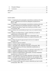 4.1 Principales Hallazgos ......................................................................................................... 80 4.2 Conclusiones ...................................................................................................................... 84 Bibliografía ....................................................................................................................................... 90 Anexo ................................................................................................................................................ 93 Lista de cuadros: Cuadro 1. Comparaciones de las principales características económicas del sector agrícola e industrial de las división de subregiones de planeación en Sonora, 2009 ............................................................................................................ 18 Cuadro 2. Comparaciones de las principales características económicas del sector agrícola e industrial de los principales municipios en Sonora, 2009 ....................... 19 Cuadro 3. Industrias que utilizan el agua como insumo por actividad o clase a nivel nacional, 2004 ................................................................................................. 23 Cuadro 4. Volumen total concesionado por tipo de usos en el estado de Sonora, 2008 ......................................................................................................................... 24 Cuadro 5 Número de establecimientos y empleo clasificado por tamaño de establecimiento en Hermosillo, 2009 ...................................................................... 26 Cuadro 6. Abastecimiento de agua por captaciones en Hermosillo, 2010 .......................... 29 Cuadro 7. Fuentes de abastecimiento de agua en la ciudad de Hermosillo, 2007- 2012 ......................................................................................................................... 30 Cuadro 8. Número de tomas de agua por tipo de servicio en la ciudad de Hermosillo, 2007 ..................................................................................................... 30 Cuadro 9. Volumen de agua por producto ........................................................................... 35 Cuadro 10. Consumo de agua / producto interno bruto ....................................................... 37 Cuadro 11. Principales ramas industriales localizadas en Hermosillo, 2009 ...................... 42 Cuadro 12. Establecimientos por divisiones industriales manufactureras en Hermosillo, 2010 ..................................................................................................... 50 Cuadro 13. Principales establecimientos por rama industrial en Hermosillo, 2010 ............ 51 Cuadro 14. Industrias clasificadas por tamaño en Hermosillo, 2010 .................................. 52 Cuadro 15. Número de establecimientos según tamaño y divisiones industriales manufactureras en Hermosillo, 2010 ....................................................................... 53 Cuadro 16. Valor agregado de las actividades industriales de Hermosillo, 2009 ............... 54 Cuadro 17. Principales ramas industriales generadoras de valor agregado, 2009 ............... 56 Cuadro 18. Consumo promedio anual de los usuarios industriales registrados por tipo de tarifa en Agua de Hermosillo, 2011, 2012 ................................................... 59 Cuadro 19. Consumo total de agua de los usuarios industriales por tipo de tarifas en Hermosillo, 2004– 2013 ...................................................................................... 61 2