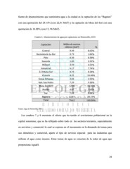 fuente de abastecimiento que suministra agua a la ciudad es la captación de los “Bagotes” con una aportación del 28.15% (con 22,41 Mm³) y la captación de Mesa del Seri con una aportación de 14.88% (con 12, 96 Mm³). Cuadro 6. Abastecimiento de agua por captaciones en Hermosillo, 2010 Captación Millón de metros cúbicos (mm³) % Central 0.49 0.62% Hacienda de La flor 0.79 1.00% Pitic 0.30 0.38% Sauceda 1.85 2.32% Willard 3.59 4.51% Industrial 6.17 7.74% Z. Urbana Sur 0.19 0.24% Victoria 8.35 10.48% Zonas Urbanas 2.03 2.55% Reb. San Pedro 7.39 9.28% Mesa Del Seri 12.96 16.28% Realito 6.07 7.62% Sur 7.04 8.84% Bagotes 22.41 28.15% Total 79.62 100.00% Fuente: Agua de Hermosillo, 2010. Los cuadros 7 y 8 muestran el efecto que ha tenido el crecimiento poblacional en la capital sonorense, que se ha reflejado sobre todo en los sectores terciarios, especialmente en servicios y comercial, lo cual se expresa en el incremento en la demanda de tomas para uso doméstico y comercial, aparte el tipo de servicio especial para las industrias que utilizan el agua como insumo. Estas tomas de agua se conectan de la redes de agua que proporciona AguaH. 29