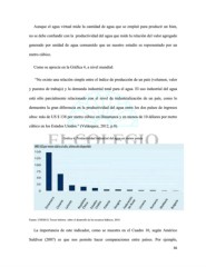 Aunque el agua virtual mide la cantidad de agua que se empleó para producir un bien, no se debe confundir con la productividad del agua que mide la relación del valor agregado generado por unidad de agua consumido que en nuestro estudio es representado por un metro cúbico. Como se aprecia en la Gráfica 4, a nivel mundial: “No existe una relación simple entre el índice de producción de un país (volumen, valor y puestos de trabajo) y la demanda industrial total para el agua. El uso industrial del agua está sólo parcialmente relacionado con el nivel de industrialización de un país, como lo demuestra la gran diferencia en la productividad del agua entre los dos países de ingresos altos: más de US $ 138 por metro cúbico en Dinamarca y en menos de 10 dólares por metro cúbico en los Estados Unidos.” (Velázquez, 2012, p.8). Gráfica 4. Productividad industrial del agua en varios países 1995 US$ por metro cúbico al año, ultimo año disponible Dinamarca Lituania Letonia República Estados Unidos Polonia Hungria Federación Ucrania Rumania Moldavia Bulgaria de Rusia Checa Fuente: UNESCO, Tercer informe sobre el desarrollo de los recursos hídricos, 2010. La importancia de este indicador, como se muestra en el Cuadro 10, según Américo Saldívar (2007) es que nos permite hacer comparaciones entre países. Por ejemplo, 36
