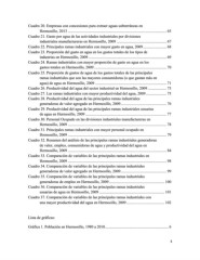 Cuadro 20. Empresas con concesiones para extraer aguas subterráneas en Hermosillo, 2013 ..................................................................................................... 65 Cuadro 21. Gasto por agua de las actividades industriales por divisiones industriales manufactureras en Hermosillo, 2009 ................................................... 67 Cuadro 22. Principales ramas industriales con mayor gasto en agua, 2009 ........................ 68 Cuadro 23. Proporción del gasto en agua en los gastos totales de los tipos de industrias en Hermosillo, 2009 ................................................................................ 69 Cuadro 24. Ramas industriales con mayor proporción de gasto en agua en los gastos totales en Hermosillo, 2009 .......................................................................... 70 Cuadro 25. Proporción de gastos de agua de los gastos totales de las principales ramas industriales que son las mayores consumidoras (o que gastan más en agua) de agua en Hermosillo, 2009 ......................................................................... 71 Cuadro 26. Productividad del agua del sector industrial en Hermosillo, 2009 ................... 73 Cuadro 27. Las ramas industriales con mayor productividad del agua, 2009 ..................... 75 Cuadro 28. Productividad del agua de las principales ramas industriales generadoras de valor agregado en Hermosillo, 2009 ............................................... 76 Cuadro 29. Productividad del agua de las principales ramas industriales usuarias de agua en Hermosillo, 2009 ................................................................................... 77 Cuadro 30. Personal Ocupado en las divisiones industriales manufactureras en Hermosillo, 2009 ..................................................................................................... 78 Cuadro 31. Principales ramas industriales con mayor personal ocupado en Hermosillo, 2009 ..................................................................................................... 79 Cuadro 32. Resumen del análisis de las principales ramas industriales generadoras de valor, empleo, consumidoras de agua y productividad del agua en Hermosillo, 2009 ..................................................................................................... 84 Cuadro 33. Comparación de variables de las principales ramas industriales en Hermosillo, 2009 ..................................................................................................... 98 Cuadro 34. Comparación de variables de las principales ramas industriales generadoras de valor agregado en Hermosillo, 2009 ............................................... 99 Cuadro 35. Comparación de variables de las principales ramas industriales generadoras de empleo en Hermosillo, 2009 ......................................................... 100 Cuadro 36. Comparación de variables de las principales ramas industriales usuarias de agua en Hermosillo, 2009 ................................................................... 101 Cuadro 37. Comparación de variables de las principales ramas industriales con una mayor productividad del agua en Hermosillo, 2009 ....................................... 102 Lista de gráficas: Gráfica 1. Población en Hermosillo, 1980 a 2010 ................................................................. 6 3