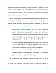 más familiarizado con la información de los censos económicos. Al final esto nos ayuda también a calcular el indicador de productividad, así como seleccionar las principales actividades industriales en la parte de las conclusiones. Las ramas industriales localizadas en Hermosillo, se presentan en el Cuadro 11. Con estas 69 ramas hicimos un resumen de las principales actividades industriales de las variables ya mencionadas para este trabajo. Lo siguiente fue encontrar las principales industrias usuarias de agua en Hermosillo; para esto se consultaron tres fuentes que consideramos importantes en este trabajo: Información del organismo operador de agua en la ciudad de Hermosillo (AguaH) de las industrias conectadas a la red de agua de la ciudad. Existe información sobre las actividades industriales que tiene registrado el organismo operador referido, el número de establecimientos y el consumo promedio anual en metros cúbicos. El Registro Público de Derechos de Agua (REPDA) de la Comisión Nacional del Agua, que brinda información de los títulos de derecho de extracción de aguas subterráneas para uso industrial y monto de extracción de agua anual. En los censos económicos de INEGI 2009, se ofrece el gasto por concepto monetario del agua de cada rama industrial en Hermosillo y que es necesario para construir el indicador de productividad del agua. Con la combinación de la información obtenida en AguaH, en el REPDA de CONAGUA y de los censos económicos de INEGI, se tiene una aproximación al consumo del agua del sector industrial en Hermosillo. En el caso de la información de AguaH nos 44
