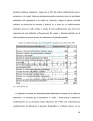 productos metálicos, maquinaria y equipo con un 19% del total de establecimientos que se encuentran en la ciudad. Estas dos actividades se pueden considerar como las actividades industriales más importantes en la ciudad de Hermosillo, aunque la primera actividad industrial de producción de alimentos y bebidas, es la mitad de los establecimientos instalados; entonces se debe analizar el tamaño de estos establecimientos para observar la importancia de estas industrias en la generación del empleo, y después analizarlo con el valor agregado que generan, de esto nos ocupamos en el apartado siguiente. Cuadro 12. Establecimientos por divisiones industriales manufactureras en Hermosillo, 2010 Divisiones de la industria Manufacturera Establecimientos % División I: Productos alimenticios, bebidas y tabaco 1,906 51% División II: Textiles , prendas de vestir e industria del cuero y del calzado 246 7% División III: Industrias y productos de madera 347 9% División IV: Papel, productos de papel, imprenta y editoriales 224 6% División V: Sustancias químicas, derivados del petróleo y el carbón 69 2% División VI: Industria de minerales no metálicos, excepto derivados del petróleo y carbón 9 0% División VII: Industrias metálicas básicas 119 3% División VIII: Productos metálicos, maquinaria y equipo 695 19% División IX: Otras industrias manufactureras 99 3% Total 3,714 100% Fuente: INEGI, DENUE, 2010. Lo siguiente es analizar las principales ramas industriales localizadas en la ciudad de Hermosillo. Los resultados que se muestran en el Cuadro 13 donde indican el número de establecimientos de las principales ramas industriales: El 37.84% está conformado por establecimientos de elaboración de productos de panadería y tortillerías, después con un 50