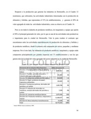 Respecto a la producción que generan las industrias en Hermosillo, en el Cuadro 12 mostramos, que sobresalen, las actividades industriales relacionadas con la producción de alimentos y bebidas, que representan el 51% de establecimientos, y generan el 20% de valor agregado de todas las actividades industriales, como se observa en el Cuadro 16. Pero es sin duda la industria de productos metálicos, de maquinaria y equipo que aporta el 58% el principal generador de valor, por lo que es una de las actividades más productivas e importantes para la ciudad de Hermosillo. Vale la pena resaltar el contraste que encontramos entre las actividades manufactureras de producción de alimentos y bebidas y de productos metálicos, donde la primera está compuesta por micro, pequeñas y medianas empresas. Por el otro lado, las industrias de productos metálicos, maquinaria y equipo están compuestos principalmente por grandes empresas son 15 establecimientos y son las que genera más de la mitad del valor agregado del sector industrial en la ciudad de Hermosillo. Cuadro 16. Valor agregado de las actividades industriales de Hermosillo, 2009 Divisiones de la industria Manufacturera Miles de pesos % División I: Productos alimenticios, bebidas y tabaco 3,963,517 20% División II: Textiles , prendas de vestir e industria del cuero y del calzado 341,805 2% División III: Industrias y productos de madera 115,874 1% División IV: Papel, productos de papel, 126,664 1% imprenta y editoriales División V: Sustancias químicas, derivados del 1,683,786 9% petróleo y el carbón División VI: Industria de minerales no metálicos, excepto derivados del petróleo y 7,978 0% carbón División VII: Industrias metálicas básicas 2,075,504 10% División VIII: Productos metálicos, maquinaria y 11,404,977 58% equipo División IX: Otras industrias manufactureras 51,926 0% Total 19,772,031 100% Fuente: INEGI, Censos económicos, 2009. 54