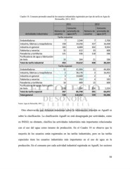 Cuadro 18. Consumo promedio anual de los usuarios industriales registrados por tipo de tarifa en Agua de Hermosillo, 2011, 2012 2011 2012 Consumo Consumo Número de promedio de Número de promedio de Actividades industriales usuarios agua (m³) usuarios agua (m³) Tarifa industrial Embotelladoras 7 2,544 7 2,700 Industria, fábricas y maquiladoras 158 14,256 157 16,428 Industria en general 102 6,600 102 9,924 Paleterías y neverías 32 612 33 600 Panaderías y tortillerías 121 336 118 336 Purificadoras de agua y fabricación de hielo 33 264 21 336 Total de tarifa industrial 453 24,612 438 30,324 Tarifa especial Embotelladoras 11 41,304 11 44,304 Industria, fábricas y maquiladoras 2 28,176 3 16,452 Industria en general 3 13,668 2 0 Paleterías y neverías 5 252 4 192 Panaderías y tortillerías 16 600 15 600 Purificadoras de aguay fabricación de hielo 230 1,740 256 1,524 Total de tarifa especial 267 85,740 291 63,072 Total general 720 110,352 729 93,396 Fuente: Agua de Hermosillo, 2013. Otra observación que debemos mencionar sobre la información obtenida en AguaH es sobre la clasificación. La clasificación AguaH no está desagregada por actividades, como en INEGI; no obstante, clasifica las actividades industriales más importantes relacionadas con el uso del agua como insumo de producción. En el Cuadro 18 se observa que la mayoría de los usuarios están registrados en las tarifas industriales, pero en las tarifas especiales tiene los usuarios industriales más importantes en el uso de agua en la producción. En el consumo por cada actividad industrial registrada en AguaH, los sectores 59