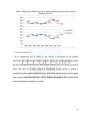 Gráfica 5. Proporción del consumo de agua de los usuarios industriales por tipo de tarifa de Agua de Hermosillo, 2004-2012 90% 83% 80% 78% 75% 73% 70% 68% 72% 68% 69% 68% 60% 50% Industrial 40% Especial 30% 32% 32% 31% 32% 25% 28% 27% 20% 22% 17% 10% 0% 2004 2005 2006 2007 2008 2009 2010 2011 2012 Fuente: Agua de Hermosillo, 2013. Si lo comparamos con la Gráfica 6, que muestra el incremento de los usuarios industriales, los resultados que podemos encontrar es que los usuarios industriales dentro del cobro de la tarifa industrial están disminuyendo mientras que en el caso de los usuarios dentro del cobro de la tarifa especial se incrementan. Como muestra la gráfica el crecimiento de los usuarios industriales dentro de la tarifa especial muestra un incremento lento en estos últimos diez años, pero a la vez aumenta alcanzando el 40% del total de los usuarios industriales registrados en AguaH. 62