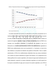 Gráfica 6. Proporción del número de los usuarios industriales por tipos de tarifa de Agua de Hermosillo, 2004-2012 90% 80% 81% 78% 75% 70% 72% 68% 65% 64% 63% 60% 60% 50% Industrial 40% 40% 35% 36% 37% Especial 30% 28% 32% 25% 20% 19% 22% 10% 0% 2004 2005 2006 2007 2008 2009 2010 2011 2012 Fuente: Agua de Hermosillo, 2013. Los puntos interesantes que merecen ser subrayados en este primer acercamiento son: la clasificación que consideramos pobre por la dificultad de determinar y conocer el consumo de todos los tipos de industrias en Hermosillo, que es la diferencia entre el número de usuarios del organismo operados de agua y el número de establecimientos de INEGI al no encontrar una coincidencia contundente. La explicación más probable es que en la facturación no se considera aproximadamente el 80% de los establecimientos registrados en INEGI como establecimientos micro (con un personal de 1 a 5 personas) y el resto de las otras industrias se encuentran las industrias más grandes de Hermosillo. Como se explicó anteriormente, el 20% de los establecimientos industriales tiene una cercana coincidencia con el número de usuarios industriales de AguaH. Para finalizar, en la comparación de las últimas gráficas de los usuarios registrados y del consumo de agua anual clasificados por de tarifas (industrial y especial), los usuarios industriales registrados en la tarifa especial son los mayores consumidores de agua, pero son pocos los usuarios registrados, son el 40% de 63
