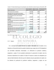 Cuadro 29. Productividad del agua de las principales ramas industriales usuarias de agua en Hermosillo, 2009 Valor agregado Gasto en agua Productividad del Ramas industriales (Miles de pesos) (Miles de pesos) agua (Pesos) 3121 Industria de las bebidas 1,148,794 9,040 127 3261 Fabricación de productos de plástico 1,188,773 4,761 250 3116 Matanza, empacado y procesamiento de carne de ganado, aves y otros animales comestibles 1,163,607 3,811 305 3118 Elaboración de productos de panadería y tortillas 715,468 1,904 376 3321 Fabricación de productos metálicos forjados y troquelados 1,479,199 1,678 882 3273 Fabricación de cemento y productos de concreto 1,964,859 1,662 1,182 3363 Fabricación de partes para vehículos automotores 1,915,073 1,422 1,347 3344 Fabricación de componentes electrónicos 341,988 923 371 3361 Fabricación de automóviles y camiones 8,337,900 911 9,152 3323 Fabricación de estructuras metálicas y productos de herrería 224,585 660 340 Total 19,772,031 32,838 602.11 Fuente: INEGI, Censos económicos, 2009. 3.3.2 Empleo En el principio del capítulo hicimos un análisis relacionado con el tamaño de las industrias en Hermosillo donde las grandes industrias (que ocupan más de 250 trabajadores) son actividades industriales relacionadas a la elaboración de productos metálicos, maquinaria y equipo. En este apartado analizaremos la generación de empleo entre las divisiones industriales de la ciudad. El Cuadro 30 muestra el número de trabajadores por cada actividad industrial; obtuvimos que las industrias mayores generadoras de empleo son: las industrias de producción de productos metálicos, maquinaria y equipo con una 77