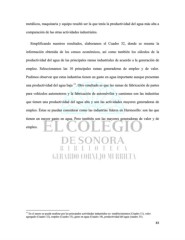 metálicos, maquinaria y equipo resultó ser la que tenía la productividad del agua más alta a comparación de las otras actividades industriales. Simplificando nuestros resultados, elaboramos el Cuadro 32, donde se resume la información obtenida de los censos económicos, así como también los cálculos de la productividad del agua de las principales ramas industriales de acuerdo a la generación de empleo. Seleccionamos las 10 principales ramas generadoras de empleo y de valor. Pudimos observar que estas industrias tienen un gasto en agua importante aunque presentan 11 una productividad del agua baja . Otro resultado es que las ramas de fabricación de partes para vehículos automotores y la fabricación de automóviles y camiones son las industrias que tienen una productividad del agua alta y son las actividades mayores generadoras de empleo. Éstas se puedan considerar como las industrias líderes en Hermosillo: son las que tienen un mayor gasto en agua. Pero también son las mayores generadoras de valor y de empleo. 11 En el anexo se puede analizar por las principales actividades industriales en: establecimientos (Cuadro 31), valor agregado (Cuadro 32), empleo (Cuadro 33), gasto en agua (Cuadro 34), productividad del agua (cuadro 35). 83