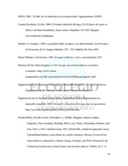 INEGI. 2002. El ABC de los indicadores de productividad. Aguascalientes: INEGI. Lezama Escalante, Cecilia. 2004. El manejo industrial del agua. En El futuro del agua en México, de Boris Graizbord y Jesus Arroyo Alejandre, 255-268. Zapopan: Universidad de Guadalajara. Mankiw, N. Gregory. 1998. La productividad: su papel y sus determinantes. En Principios de Economia, de N. Gregory Mankiw, 472 - 474. Madrid: Mc Graw Hill. Marin Stillman, Luis Ernesto. 2002. El agua en Mexico: retos y oportunidades. D.F. Martinez De Ita, Maria Eugenia. s.f. El concepto de productividad en el análisis económico. http://www.critica- azcapotzalco.org/AECA/promotores/archivo%20laboral/eugenia1.pdf. Organizacion de las Naciones Unidas para el Desarrollo Industrial. s.f. Agua e Industria. Organizacion de las Naciones Unidas para el Desarrollo Industrial. Organizacion de las Naciones Unidas para la Agricultura (FAO) Departamento de desarrollo sostenible. 2003. Descubrir el potencial del agua para la agricultura. http://www.fao.org/docrep/006/y4525s/y4525s06.htm. Pineda-Pablos, Nicolás, Scott, Christopher A., Wilder, Margaret, Salazar-Adams, Alejandro, Díaz-Escalante, Rolando, Brito, Luis, Watts, Christopher, Moreno, José Luis, Oroz, y Neri, Carolina Lucas. 2012. Hermosillo, ciudad sin agua para crecer. Vulerabilidad hidrica y retos frente al c ambio climatico. Moving Forward from vulnerability to Adaptation: Climate change, Drought, and Water Demand in the Urbanizing Southwestern United States and Northern Mexico. Wilder, M. C. A. 91