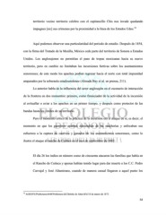 territorio vecino territorio celebro con el capitancillo Chis nos invade quedando 16 impugnes [sic] sus crímenes por la proximidad a la línea de los Estados Udos. Aquí podemos observar una particularidad del periodo de estudio. Después de 1854, con la firma del Tratado de la Mesilla, México cede parte del territorio de Sonora a Estados Unidos. Los anglosajones no permitían el paso de tropas mexicanas hacia su nuevo territorio, pero en cambio no limitaban las incursiones furtivas sobre los asentamientos sonorenses; de este modo los apaches podían regresar hacia el norte con total impunidad amparados por la soberanía estadounidense (Almada Bay et al. en prensa, 211). Lo anterior habla de la influencia del actor anglosajón en el escenario de interacción de la frontera en dos momentos: primero, como financiador de la actividad de la incursión al avituallar o aviar a los apaches en un primer tiempo, y después como protector de las bandas hasta los límites de su territorio. Pero el momento crítico de la práctica de la incursión era el ataque en sí, es decir, el momento en que los guerreros apaches descendían de las rancherías y enfocaban sus esfuerzos a la captura de cautivos y ganados de los asentamientos sonorenses, como lo ilustra el ataque al rancho de Cuitaca en el mes de septiembre de 1882: El día 26 los indios en número como de cincuenta atacaron las familias que había en el Rancho de Cuitaca y apenas habían tenido lugar para dar muerte a los C.C. Pedro Carvajal y José Altamirano, cuando de manera casual llegaron a aquel punto los 16 AGES/FE/Prefecturas/t448/Prefectura del Distrito de Altar/sf/sl/18 de marzo de 1873. 54