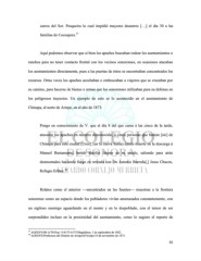 carros del Sor. Pesqueira lo cual impidió mayores desastres […] el dia 30 a las 17 familias de Cocospera. Aquí podemos observar que si bien los apaches buscaban rodear los asentamientos o ranchos para no tener contacto frontal con los vecinos sonorenses, en ocasiones atacaban los asentamientos directamente, pues a las puertas de éstos se encontraban concentrados los recursos. Otras veces los apaches acechaban o emboscaban a viajeros que se cruzaban por su camino, para hacerse de bienes o armas que los sonorenses utilizaban para su defensa en los peligrosos trayectos. Un ejemplo de esto es lo acontecido en el asentamiento de Chinapa, al norte de Arizpe, en el año de 1873: Pongo en conocimiento de V. que el día 8 del que cursa á las cinco de la tarde, atacaron los apaches en número desconocido, á cinco personas que benian [sic] de Chinapa para esta ciudad [Ures], (en la cueva Santa) dando muerte en la descarga á Manuel Bustamante, herido Bacilio Jaimes en su muslo, saliendo para atrás desmontados haciendo fuego en retirada con Dn Antonio Barreda[,] Jesus Chacon, 18 Refugio Eribes. Relatos como el anterior encontrados en las fuentes muestran a la frontera sonorense como un espacio donde los pobladores vivían amenazados constantemente, con un sigiloso enemigo aguardando en el monte y en lo despoblado, con el temor de ser sorprendidos incluso en la proximidad del asentamiento, como lo sugiere el reporte de 17 AGES/FE/RI-A/T8/Exp 11/6173-6175/Magdalena, 1 de septiembre de 1882. 18 AGES/FE/Prefectura del Distrito de Arizpe/sf/Arizpe/10 de noviembre de 1873. 55