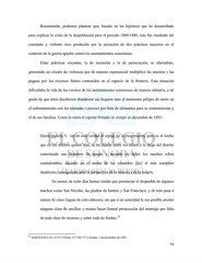 Resumiendo, podemos plantear que, basado en las hipótesis que he desarrollado para explicar la crisis de la despoblación para el periodo 1860-1886, ésta fue resultado del constante y violento roce producido por la ejecución de dos prácticas mayores en el contexto de la guerra apache contra los asentamientos sonorenses. Estas prácticas cruzadas, la de incursión y la de persecución, se alternaban, generando un círculo de violencia que de manera exponencial multiplicó las muertes y las pugnas por los recursos finitos contenidos en el espacio de la frontera. Esta situación dificultaba la vida de los vecinos de los asentamientos sonorenses de manera rutinaria, a tal grado de que éstos decidieron abandonar sus hogares ante el inminente peligro de morir en el enfrentamiento con los nómadas o perecer por falta de elementos para su sostenimiento y el de sus familias. Como lo narra el reporte firmado en Arizpe en diciembre de 1883: Quizá pudiera V. ver en esta verdad el ropaje de la exageración, pero es el hecho que en los últimos quince días, se ha dejada sentir los indios a lo largo del distrito cometiendo sus desastres de sangre y sacando de todos los ranchos robos considerables, dejando en el animo de los creadores [sic] el más completo desaliento, consiguiente ante la perspectiva de la miseria y de la muerte. En menos de ocho días hemos tenido que presenciar el despueble de algunos ranchos como San Nicolás, las piedras de lumbre y San Francisco, y de esto pasa á menos de cinco leguas de esta cabecera, sin que á mi autoridad le sea posible prestar ninguna clase de auxilios y menos hacer formal persecución del enemigo por falta 32 de toda clase de recursos y sobre todo de fondos. 32 AGES/FE/R.I-A/C.333/T.10/Exp 1/f.7169-7171/Arizpe, 7 de diciembre de 1883. 74