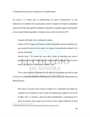 4. Estímulos fiscales para la colonización y el repoblamiento. Los apoyos y el interés para el establecimiento de nuevos asentamientos no sólo obedecieron a la iniciativa de los particulares; desde el Congreso del Estado se preparaban exenciones fiscales para aquellos ciudadanos interesados en repoblar espacios determinados y de este modo brindar seguridad a la frontera, como ocurrió en el año de 1879: Congreso del Estado Libre y Soberano de Sonora Número 104 El Congreso del Estado en nombre del pueblo, decreta la siguiente Ley que exonera del servicio de las armas y del pago de la contribución ordinaria á los colonos del Bácachi. Artículo único,- “Se exonera por cinco años á todos los individuos que vayan á poblar el punto llamado el Bácachi, en el Distrito de Moctezuma, del servicio de las 38 armas y del pago de la contribucion ordinaria” [sic]. Tal vez esta exención de impuestos tuvo su razón en las peticiones que hizo la Junta revisora de la cabecera del distrito de Moctezuma en el año de 1862, cuyo representante era Manuel Moreno: Esta Junta en acuerdo de hoy resolvió consultar al C. Gobernador del Estado por conducto de esa Prefectura si para el cobro del impuesto que establece la ley de 26 de Dbre. últo. se valorisan o gravan las fincas abandonadas á consecuencia de la guerra de apaches, pues aunque la ley no hace en esto ninguna distinción, la junta 38 AGES/FE/Prefecturas/T 474/Decretos de Estado/sf/Hermosillo/15 de agosto de 1879. 88