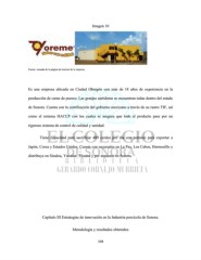 Imagen 10 Fuente: tomada de la página de internet de la empresa Es una empresa ubicada en Ciudad Obregón con más de 18 años de experiencia en la producción de carne de puerco. Las granjas surtidoras se encuentran todas dentro del estado de Sonora. Cuenta con la certificación del gobierno mexicano a través de su rastro TIF, así como el sistema HACCP con los cuales se asegura que todo el producto pase por un riguroso sistema de control de calidad y sanidad. Tiene capacidad para sacrificar 489 cerdos por día con permiso para exportar a Japón, Corea y Estados Unidos. Cuenta con sucursales en La Paz, Los Cabos, Hermosillo y distribuye en Sinaloa, Yucatán, Tijuana y por supuesto en Sonora. Capítulo III Estrategias de innovación en la Industria porcícola de Sonora. Metodología y resultados obtenidos 104