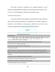 Para efectos de realizar la explicación de los resultados obtenidos, así como mantener la confidencialidad de las empresas, se hará la descripción de las mismas como A, B, C, D, E y F en la interpretación y análisis de lo encontrado en campo. b) Descripción de la encuesta La encuesta se dividió en cuatro apartados que juntos permiten recoger la opinión de quienes están involucrados directamente en la elaboración de un producto competitivo y reconocido a nivel mundial por su sabor, higiene y calidad como es la carne de cerdo sonorense. Enseguida hacemos una descripción general del instrumento. Cuadro15 Descripción general de la encuesta I- Datos generales En este apartado interesa recoger la información única de identificación de la empresa, el mercado al que dirigen sus ventas, así como el personal que labora en la empresa. a) Información general de la empresa: nombre, localidad, actividad, año de fundación, teléfono b) Destino de las ventas como porcentaje del total c) Distribución del personal y grado de escolaridad del mismo II. Capacidad de absorción Aquí lo que se pretende es analizar la capacidad de la empresa para hacerse llegar conocimiento, adquirirlo, y explotarlo en acciones que contribuyan a mejorar sus procesos en base a la capacitación, certificación y uso de tecnología a) Servicios de asesores o especialistas contratados por la empresa b) Estrategias de innovación desarrolladas por la empresa en los últimos 3 años c) Certificaciones obtenidas y cursos de capacitación proporcionados d) Tecnología utilizada en el proceso de producción 108