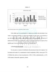Gráfico 13 Fuente: elaboración propia con base en información recibida en encuesta Cabe señalar que no necesariamente la empresa que destina más porcentaje de sus ventas a un mercado específico, es quién más toneladas de carne envía a ese mercado ya que cada empresa tiene diferente capacidad de producción; así por ejemplo, si la empresa D destina más porcentaje de su producción a cubrir el mercado nacional que la empresa B, no significa que D envía más toneladas de carne a ese mercado que B. 2) Distribución del personal En este punto se muestra la distribución del personal por áreas de la empresa. Con los números del cuadro 16 y considerando el total de empleados (6 984), vemos que el 77% (5 440)de ellos están en el área de producción, el 20% (1 364) en administración, y el 3% (199) restante a Desarrollo, ingeniería y diseño. 112