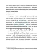las que dan mayor cobertura al mercado de exportación y son también las que más personal ocupan en desarrollo, ingeniería y diseño, lo que seguramente se refleja en más actividades de innovación, situación que se podrá comprobar en los siguientes apartados especialmente en el cuarto y último de la encuesta. b) Capacidad absorción. En esta parte de la encuesta se quiere conocer las capacidades adquiridas por la empresa para obtener conocimientos, apropiarse de ellos y explotarlos en beneficio de los procesos que desarrollan. Para ello, este segundo apartado se compone de tres puntos: el primero se refiere a los servicios de asesores o especialistas externos contratados por la empresa para obtener información y conocimientos; el segundo trata de las principales estrategias implementadas para incrementar la competitividad; y el tercer punto hacer ver las certificaciones y capacitaciones obtenidas para mejorar los procesos. 1) Contratación de especialistas o asesores externos En esta parte se busca conocer los servicios de asesores o especialistas externos contratados por la empresa, que apoyen la integración y actualización de las necesidades 39 propias y del mercado, así como mejorar las áreas de trabajo. En el gráfico 14 resulta fácil identificarla prioridad que otorgan a la contratación de especialistas en elaboración de 39 En el gráfico se presentan tres niveles de importancia que las empresas le otorgaron a la contratación de los especialistas externos: 3 muy importante; 2 importante; y 1 algo importante. 114