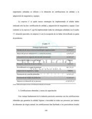 importantes señaladas se refieren a la obtención de certificaciones de calidad, y la adquisición de maquinaria y equipos. La empresa C es quién menos estrategias ha implementado al señalar haber realizado solo las dos: certificación de calidad, y adquisición de maquinaria y equipo. Caso contrario es la empresa F, que ha implementado todas las estrategias señaladas en el cuadro 17; situación parecida a la empresa A con la excepción de no haber diversificado su gama de productos. Cuadro 17 Estrategia implementada Empresa Introducción de nuevas técnicas/metodologías organizacionales A, D, E y F Mejora del proceso administrativo y control de proyectos A, B, D y F Adecuación de las exigencias del mercado internacional A, D, E y F Obtención de certificaciones de calidad TODAS Búsqueda y desarrollo de nuevos clientes A, D y F Diversificación en su gama de productos B, C, E y F Adquisición de maquinaria y equipo TODAS Disminución de costos de producción A, D, E y F Disminución de tiempos de producción A, D, E y F Mejoras en el desarrollo de los procesos A, B, D, E y F Fuente: elaboración propia con base en la información obtenida en la encuesta 3) Certificaciones obtenidas y cursos de capacitación Una ventaja fundamental de la industria porcícola sonorense son las certificaciones obtenidas que garantiza la calidad, higiene e inocuidad en todos sus procesos; por tratarse de alimentos de origen animal, las certificaciones han facilitado a los porcicultores locales 116