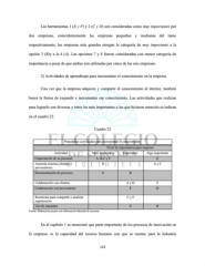 Las herramientas 1 (E y F) y 2 (C y D) son consideradas como muy importantes por dos empresas, coincidentemente las empresas pequeñas y medianas del ramo respectivamente; las empresas más grandes otorgan la categoría de muy importante a la opción 3 (B)y a la 4 (A). Las opciones 7 y 8 fueron consideradas con menor categoría de importancia a pesar de que ambas son utilizadas por cinco de las seis empresas. 2) Actividades de aprendizaje para incrementar el conocimiento en la empresa Una vez que la empresa adquiere y comparte el conocimiento al interior, también busca la forma de expandir e incrementar ese conocimiento. Las actividades que realizan para lograrlo son diversas y entre las más importantes a las que hicieron mención se indican en el cuadro 22. Cuadro 22 Principales actividades para incrementar el conocimiento Nivel de importancia para empresa Actividad Muy importante Importante Algo importante Capacitación de su personal A, B,C y F E Asesoría externa (clientes o D A y C proveedores) Documentación de procesos E B Colaboración con clientes A y D F Colaboración con proveedores F D Reuniones para compartir y analizar C y F experiencias Uso de manuales E B Fuente: Elaboración propia con información obtenida de encuesta En el capítulo 1 se mencionó que parte importante de los procesos de innovación en la empresa, es la capacidad del recurso humano con que se cuenta; para la industria 122