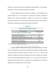 existente en el mercado; cuatro de ellas manifestaron haber generado un nuevo producto, que aunque ya existía en el mercado la empresa no lo producía. Las únicas empresas que han creado un nuevo producto o lo han mejorado para el mercado nacional son A y B; la empresa B es la única que ha creado, y mejorado un producto para el mercado internacional, y también es la única que no ha realizado innovaciones comunes al resto de las empresas: nuevas para la empresa, pero existentes en el mercado y, mejorado para el empresa pero existente en el mercado. Cuadro 24 Innovación de producto realizado por la empresa Tipo de innovación Empresa innovadora Nuevo para la empresa, pero existente en el mercado A, D, E y F Nuevo para el mercado nacional A y B Nuevo para el mercado internacional B Mejorado para su empresa, pero existente en el mercado A, C, D, E y F Mejorado para el mercado nacional A y B Mejorado para el mercado internacional B Fuente: Elaboración propia con información obtenida de encuesta El gráfico 18muestra los tipos de innovaciones en procesos realizados en los últimos 3 años. El mejoramiento de los procesos de producción ya utilizados en la empresa aparece como la innovación más frecuente, siendo las empresas A, B, D, E y F las que lo han realizado; la adopción de procesos de producción nuevos para la empresa, pero existentes en el sector ha sido implementado por las empresas A, C, D y E. De nuevo la empresa B se caracteriza por aplicar innovaciones no realizada por sus competidores al ser la única en adoptar procesos de producción nuevos para el sector. 128