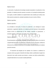 Hipótesis General La innovación y la aplicación de tecnología avanzada incorporados a la producción, le han permitido a la industria porcicola sonorense convertirse en la principal actividad pecuaria de la región, al exhibir estándares de competitividad de clase mundial que la ubican como líder nacional en producción y principal exportadora de carne de cerdo en México. Hipótesis específicas Hipótesis específica 1 Las actividades de innovación, la técnicas de producción y las estrategias de mejora operacional y organizativa aplicados en la industria porcícola sonorense le han permitido alcanzar niveles de competitividad de talla mundial, expresado en exportaciones a mercados exigentes y sofisticados como Japón, Corea y Estados Unidos. Hipótesis específica 2 El posicionamiento como principal exportadora de carne de cerdo en México, los niveles de competitividad alcanzados en la producción y la apertura de nuevos mercados, confirman la eficiencia de los sistemas de innovación y de tecnología avanzada utilizados por la industria porcícola sonorense. El documento está integrado por tres capítulos. En el primero se establecen los conceptos teóricos que guían el desarrollo del trabajo, donde se problematiza el papel de la innovación como medio necesario para alcanzar y sostener una efectiva productividad y competitividad dentro de un escenario mundial globalizado. 13