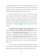 en la última la cabeza de lomo. Al lado de cada banda trabajan máquinas que le quitan el cuero a la carne, así como herramientas que le dejan al corte la grasa que el cliente japonés demanda. La mayoría de las maquinas que operan son de Estados Unidos ya que ahí es más fácil adquirirlas, aunque también operan maquinas de Brasil y Holanda. Nos indicó que únicamente se exporta a Japón, ya que les ha sido muy difícil ingresar al mercado de Estados Unidos por lo complicado de los trámites, y los permisos del gobierno americano. Nos comentaba que “el cliente japonés es muy quisquilloso en la demanda de su producto pero siempre está dispuesto a pagar un buen precio por los cortes que ellos quieren”. También señalo que han mandado productos a China, pero son huesos, viseras verdes y rojas; “el chino no está dispuesto a pagar bien, es un mercado complicado de negociar”. Sobre la calidad tecnológica de sus maquinas y equipos, señaló que tal vez están por debajo de la utilizada en los países desarrollados, pero en el promedio con otros países. “Incluso superior a la tecnología utilizada en los rastros de México”. “Pero me ha tocado ir a capacitaciones a Estados Unidos y Canadá, y ellos utilizan maquinaria automática y semiautomática que les permite producir más en menos tiempo y con mayor precisión”. Mencionaba que ha visitados rastros de el Estado de México y Veracruz, donde ha podido apreciar que tienen instalaciones muy precarias y sin las condiciones de higiene que se tienen en Sonora. “Los rastros de Jalisco y Yucatán también tienen buena tecnología en sus plantas, pero no producen los cortes especiales que nosotros hacemos, además que aquí está libre de enfermedades y la carne tiene un sabor especial que el japonés valora mucho y prefiere”. 142