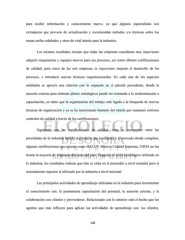 para recibir información y conocimiento nuevo, ya que algunos especialistas son extranjeros que proveen de actualización y recomiendan métodos y/o técnicas sobre los temas arriba señalados y otros de vital interés para la industria. Los mismos resultados arrojan que todas las empresas consideran muy importante adquirir maquinarias y equipos nuevos para sus procesos, así como obtener certificaciones de calidad; para cinco de las seis empresas es importante mejorar el desarrollo de los procesos, e introducir nuevas técnicas organizacionales. En cada uno de los aspectos señalados se aprecia una relación con lo expuesto en el párrafo precedente, donde la asesoría externa para elaborar planes estratégicos puede ser orientada a la modernización o capacitación, en tanto que la organización del trabajo está ligada a la búsqueda de nuevas técnicas de organización y ya se ha mencionado bastante del interés por mantener estrictos controles de calidad a través de las certificaciones. Siguiendo con las certificaciones de calidad, éstas se encuentran entre las prioridades de la industria debido al producto que se elabora y al mercado donde compiten; algunas certificaciones que poseen como HACCP, México Calidad Suprema, USDA no las tienen la mayoría de empresas del resto del país. Respecto al nivel tecnológico utilizado en la industria, los resultados indican que éste se sitúa en el promedio a nivel mundial pero sí notoriamente superior al utilizado por la industria a nivel nacional. Las principales actividades de aprendizaje utilizadas en la industria para incrementar el conocimiento son: la permanente capacitación del personal, la asesoría externa, y la colaboración con clientes y proveedores. Relacionado con lo anterior está el hecho que los agentes que más influyen para aplicar las actividades de aprendizaje son: los clientes, 148