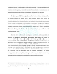 consultores externos y los proveedores. Esto viene a confirmar la vinculación que el sector mantiene con estos agentes, y para poder satisfacer las necesidades y recomendaciones del mercado se prioriza la capacitación y la certificación del personal y los procesos. El objetivo general de la investigación es analizar los tipos de innovación que utiliza la industria porcícola de Sonora que le han permitido alcanzar esos niveles de competitividad superiores al resto del país; en ese sentido, los puntos tocados anteriormente ayudan en parte a ese propósito ya que responden a los objetivos específicos; sin embargo, enseguida se presentan algunos puntos que permiten cumplir con el objetivo principal al destacar de forma precisa los tipos de innovación realizados que contribuyen a la competitividad del sector. Derivado de la modernización tecnológica de la industria, de las capacidades de absorción y aprendizajes tecnológicos desarrollados para adquirir y difundir el conocimiento, así como la participación de agentes externos, es que la industria ha desarrollado innovaciones que le permiten mantener su estatus competitivo nacional, así como su consolidación en los mercados externos. Todas las empresas manifestaron haber mejorado alguno de sus productos, o haber creado uno nuevo para ellos aunque ya existente 51 en el mercado. Entre los principales están los alimentos tenderizados, en charola semipreparados, frescos, congelados, listo para cocinar que se elaboran con un valor agregado que marca una diferencia importante con otros productos nacionales. 51 La tenderización es utilizada en la industria cárnica para la elaboración de gran cantidad de productos de alto valor agregado; entre ellos los productos marinados con un sabor específico. 149
