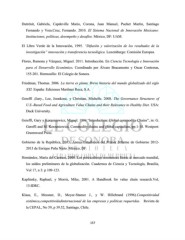 Dutrénit, Gabriela, Capdeville Mario, Corona, Juan Manuel, Puchet Martin, Santiago Fernando y Vera.Cruz, Fernando. 2010. El Sistema Nacional de Innovación Mexicano: Instituciones, políticas, desempeño y desafíos. México, DF: UAM. El Libro Verde de la Innovación, 1995. “Difusión y valorización de los resultados de la investigación” innovación y transferencia tecnológica. Luxemburgo: Comisión Europea. Flores, Ramona y Vázquez, Miguel. 2011. Introducción. En Ciencia Tecnología e Innovación para el Desarrollo Económico, Coordinado por Álvaro Bracamonte y Oscar Contreras, 155-201. Hermosillo: El Colegio de Sonora. Friedman, Thomas. 2006. La tierra es plana. Breve historia del mundo globalizado del siglo XXI. España: Ediciones Martínez Roca, S.A. Gereffi ,Gary., Lee, Joonkooc. y Christian, Michelle. 2008. The Governance Structures of U.S.-Based Food and Agriculture Value Chains and their Relevance to Healthy Diet. USA: Duck University. Gereffi, Gary y Korzeniewicz, Miguel. 1994.“Introduction: Global commodity Chains”, in: G. Gereffi and M. Korzeniewics, Commodity chains and global capitalism, pp.1-14. Westport: Greenwood Press. Gobierno de la República, 2013. Anexo Estadístico del Primer Informe de Gobierno 2012- 2013 de Enrique Peña Nieto. México, DF. Hernández, María del Carmen, 2000. Los porcicultores sonorenses frente al mercado mundial, los saldos preliminares de la globalización. Cuadernos de Ciencia y Tecnología, Brasilia, Vol 17, n 3: p 109-123. Kaplinsky, Raphael, y Morris, Mike, 2001. A Handbook for value chain research.Vol, 13:IDRC. Klaus, E., Messner, D., Meyer-Stamer J., y W. Hillebrand (1996).Competitividad sistémica,competitividadinternacional de las empresas y políticas requeridas. Revista de la CEPAL, No 59, p 39.52, Santiago, Chile. 157