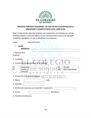 INDUSTRIA PORCICOLA SONORENSE: UN CASO DE ÉXITO SUSTENTADO EN LA INNOVACIÓN Y COMPETITIVIDAD LOCAL (1990-2010). Nota: La información obtenida mediante este cuestionario será utilizada con estricta confidencialidad y su difusión pública se hará exclusivamente en forma de tabulados estadísticos agregados, sin que se identifique a las empresas. Fecha: No.Cuestionario I. DATOS GENERALES 1. Nombre de la Empresa: 2. Localidad: 3. ¿Cuál es la actividad principal de la empresa? 01 Producción 03 Servicio 02 Ventas y/o 04 Otra (especifique) Comercio 4. En qué año se fundó esta empresa 5. Página web: 6. Teléfono: 7. Nombre de la persona que responde el cuestionario 8. Correo electrónico 9. Posición en la Empresa 163