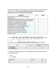 14. Señale las estrategias más importantes que han implementado en su empresa durante los últimos 5 años. De las opciones señaladas, ¿cuáles son las 3 más importantes? Ordene iniciando con 3 en la actividad más importante. Estrategias Si Orden 1)Introducción de nuevas técnicas/metodologías organizacionales 2) Mejora del proceso administrativo y control de proyectos 3) Adecuación a las exigencias del mercado internacional 4) Obtención de certificaciones de calidad 5) Búsqueda y desarrollo de nuevos clientes 6) Diversificación en su gama de productos 7) Concentración en una sola gama de productos 8) Adquisición de maquinaria y equipo 9) Disminución de costos de producción 10) Disminución de tiempos de producción 11) Mejoras en el desarrollo de los procesos 12) Otros ¿Cuáles? 15. ¿Esta empresa ha proporcionado capacitación a sus empleados en los últimos 5 años? Si No 16. ¿Cuáles son los principales temas de capacitación en que ha invertido la empresa? 17. ¿Tiene un plan sistematizado para que sus empleados reciban cursos de capacitación, en los próximos 3 años? 1) No 2) Sí, ¿Cuáles? 165