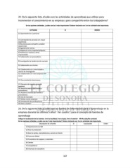 22. De la siguiente lista ¿Cuáles son las actividades de aprendizaje que utilizan para incrementar el conocimiento en su empresa y para compartirlo entre los trabajadores? De las opciones señaladas, ¿cuáles son las 3 más importantes? Ordene iniciando con 3 en la actividad más importante. ACTIVDAD SI ORDEN 1) Capacitación de su personal 2) Contratación de personal con mayor experiencia 3) Reuniones para compartir y analizar experiencias 4) Ingeniería de reversa 5) Adaptación de la maquinaria/equipo 6) Asistencia a eventos o ferias empresariales 7) Colaboración con proveedores 8) Investigación de tendencias de mercado 9) Colaboración con clientes 10) Colaboración con universidades o centros de investigación 11) Colaboración con otras empresas del sector 12) Documentación de procesos 13) Esquema de maestro-aprendiz (padrino) 14) Asesoría externa (de clientes o proveedores) 15) Asistencia técnica (de clientes o proveedores) 16) Uso de manuales 17) Visitas a otras empresas 18) Introducción de certificaciones 19) Otros ¿Cuáles? 23. De la siguiente lista ¿Cuáles son las fuentes de información para el aprendizaje en la empresa durante los últimos 5 años? Ver cuadro 1 para el concepto de fuentes de aprendizaje Indique la localización de las fuentes: 1=en la localidad; 2=en el país; 3=en el exterior 99=No sabe/No contestó De las opciones señaladas, ¿cuáles son las 3 más importantes? Ordene iniciando con 3 en la actividad más importante. Descripción de la fuente Si Localización Orden 1) Departamento de I&D 2) Área de producción 3) Área de ventas, mercadotecnia y servicio al cliente 4) Empresas aliadas 5) Proveedores de equipos y materiales 6) Clientes 7) Competidores 8) Empresas de consultoría 167